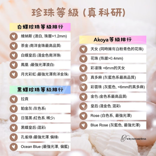 日本AKOYA アコヤ真珠廣受人喜愛是因為其上品優雅的光澤,主要有的顏色為白粉色系(粉色),白青色系(綠色),米色系,金色系為中心,而當中白粉色系因為帶有粉紅色彩,比較受年輕人喜愛。