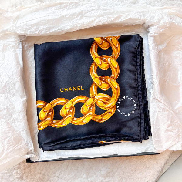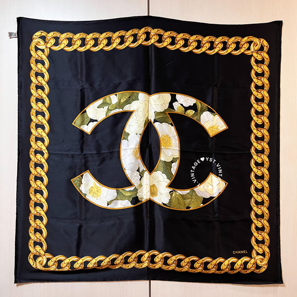 Vintage Chanel Camellia Coco Mark Silk Scarf 90 - Black*Gold